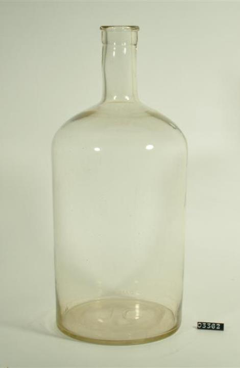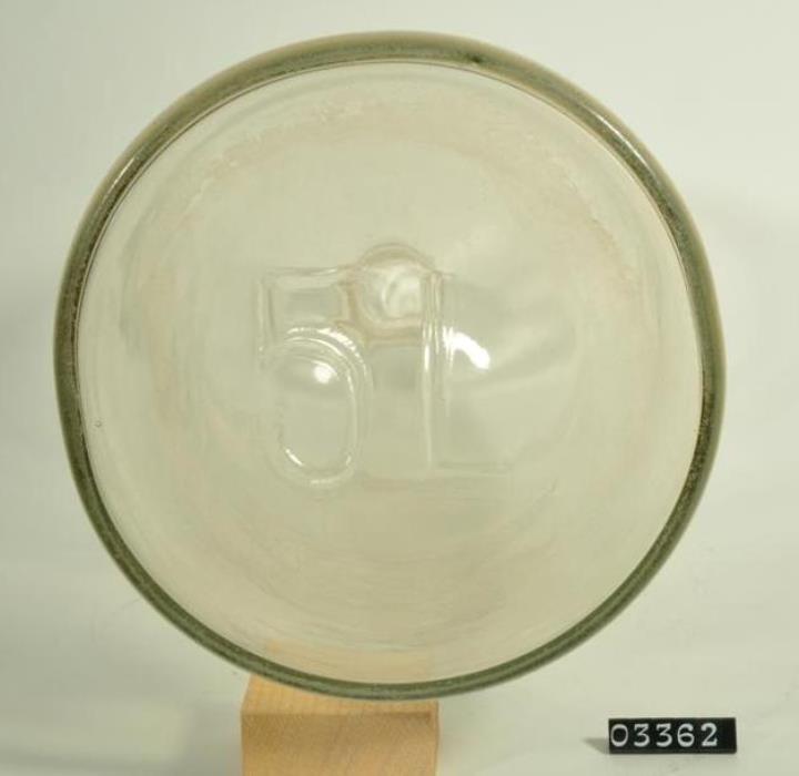Zylinderförmige, farblose Glasflasche. Manuell aufgesetzter langer, unregelmäßig geblasener Hals, Mündungsrand mit umgelegtem Glasfaden. Leicht hochgewölbter Boden mit Bodenprägung (5L), fast planer Standring.