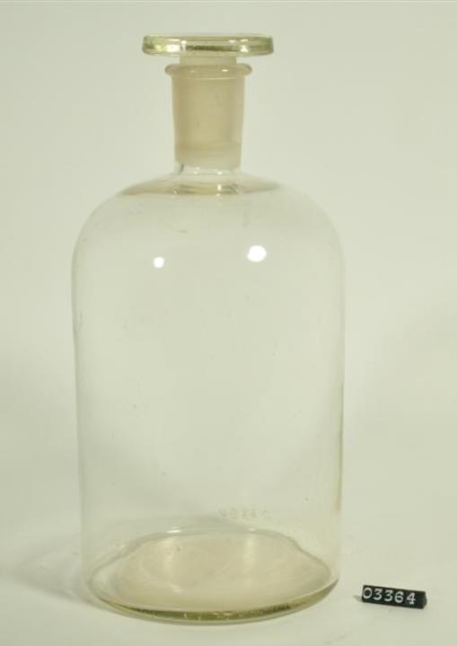 Zylinderförmige, farblose Glasflasche. Viele kleine Lufteinschlüsse. Wellige Oberfläche. Manuell aufgesetzter Hals, Mündung geschliffen, massiver Glasstöpsel mit flachem Knauf. Leicht hochgewölbter Boden, planer Standring.