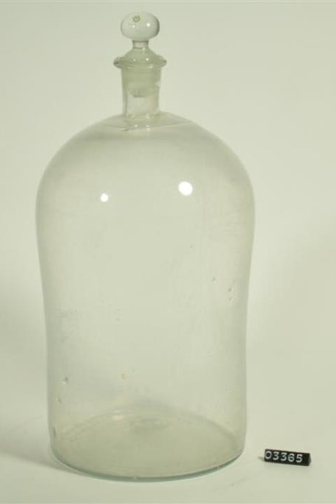 Zylinderförmige, sich nach oben weiterwerdende, (bauchige) farblose Glasflasche. Wellige Oberfläche, Innenfläche trüb durch Ablagerungen. Manuell aufgesetzter Hals, Mündung geschliffen, massiver Glasstopfen mit rundem Knauf. Hochgewölbter Boden mit Hefteisenabriss.
