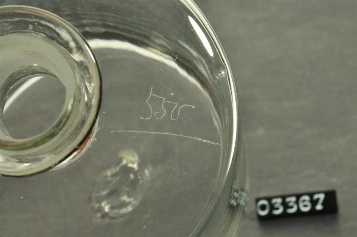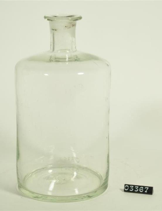 Zylinderförmige, farblose Glasflasche. Wellige Oberfläche. Flache Schulter mit Gravur (550). Manuell aufgesetzter, innen geschliffener, Hals. Mündung ausgebogen jedoch ohne Glasstopfen. Leicht hochgewölbter Boden, mit Hefteisenabriss. Planer Standring.