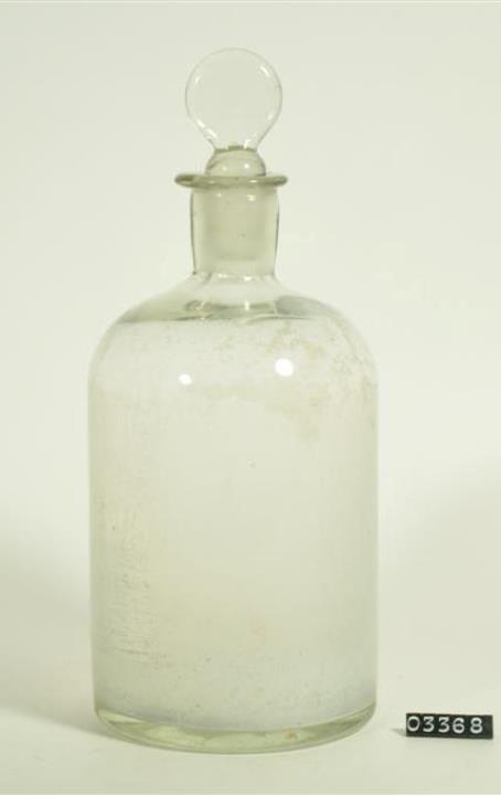 Zylinderförmige, farblose Glasflasche. Wellige Oberfläche, Innenfläche trüb durch Ablagerungen. Manuell aufgesetzter, innen geschliffener Hals. Massiver Glasstopfen mit flachem Knauf. Leicht hochgewölbter Boden mit ausgeschliffenem Hefteisenabriss. Planer Standring.