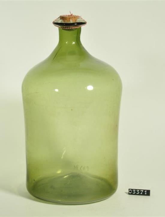 Zylinderförmige, grüne, mundgeblasene Glasflasche. Oberfläche mit Schlieren, leicht eingebaucht. Manuell aufgesetzter Hals. Mündungsrand ausgebogen, mit Kork verschlossen. Hochgestochener Boden mit Hefteisenabriss. Fast planer Standring.