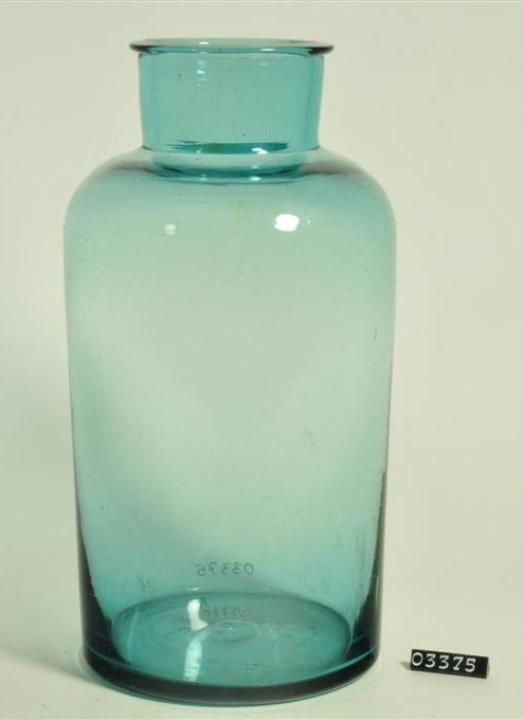 Zylinderförmige, blaugrüne, mundgeblasene Weithalsflasche aus Glas. Viele kleine Lufteinschlüsse. Manuell aufgesetzter Hals. Aufgelegter Halsfaden mit abgeflachtem Profil. Hochgestochener Boden mit Hefteisenabriss. Fast planer Standring.