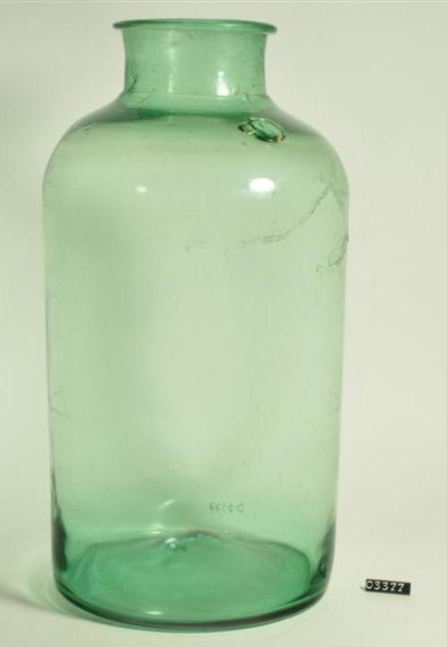Zylinderförmige, hellgrüne, mundgeblasene Weithalsflasche aus Glas. Wellige Oberfläche. Manuell aufgesetzter Hals. Mündung mit aufgelegtem Halsfaden und abgeflachtem Profil. An der Schulter aufgeschmolzenes Siegel mit Prägung, maximaler Durchmesser 34mm. Hochgestochener Boden mit Hefteisenabriss. Fast planer Standring. Sprung an der Wand.