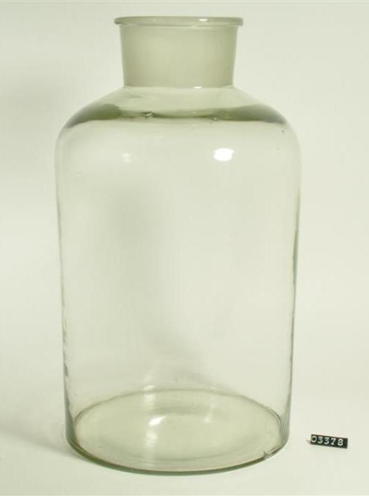 Zylinderförmige, farblose Weithalsflasche aus Glas. Wellige Oberfläche. Manuell aufgesetzter Hals. Mündung mit aufgelegtem Halsfaden und abgeflachtem Profil, innen geschliffen. Dazugehöriger Glasstopfen fehlt. Fast planer Standring. Sprung im Bodenbereich.