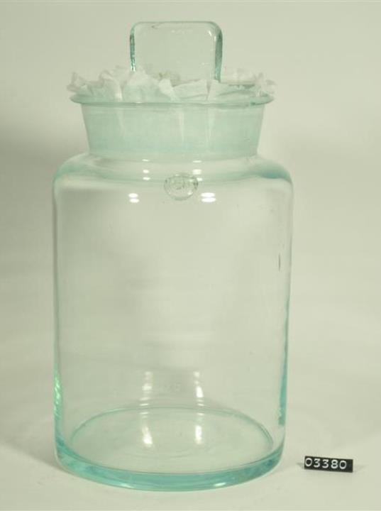Zylinderförmige, hellgrüne, mundgeblasene Weithalsflasche aus Glas. Wellige Oberfläche. Manuell aufgesetzter Hals. Mündung mit aufgelegtem Halsfaden und innen geschliffen, mit dazugehörigem Glasstopfen. An der Schulter aufgeschmolzenes Siegel mit Prägung des Volumens in Liter, Durchmesser 22mm. Hochgestochener Boden mit Hefteisenabriss, Durchmesser 62mm. Fast planer Standring.