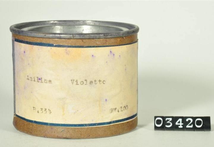 Zylindrische Patentdeckeldose aus Blech, gefalzt und gelötet. Oberer Dosenrand mit eingefalztem Patentring. Deckel unbedruckt. Mantelfläche und Boden mit braunem Papier überzogen und lackiert. Zugeschnittenes Etikett der Firma Guglielmo Brauns aus Desio (MI). Enthält den syntetischen Anilin-Farbstoff violett.