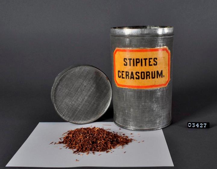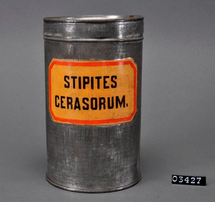 Zylindrische Blechdose mit Blechstülpdeckel. Gefalzt und gelötet. Boden mit Standring. Signiert. Mit Signierapparat bedrucktes und mit Schilderlack überzogenes Papierschild, achteckig, mit rotem Rand und roter Schrift auf ehemals weißem Grund. Enthält geschnittene Kirschstengel.