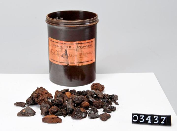 Runde, braune Salbendose aus Bakelit Schraubdeckel. Boden leicht eingewölbt. Bodenprägung: 150, kreisförmig eingerahmt. Enthält Katechut in dunkelbraunen unregelmäßig gebrochenen Stücken. Signiert mit Etikett der Farmacia Peer.