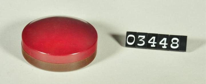 Runde, flache, braune Salben- oder Pillendose aus Bakelit mit nach oben gewölbtem roten Schraubdeckel. Leicht eingewölbter Boden mit Standring. Im Deckel innen ist das Firmenlogo (FBA) eingeprägt.