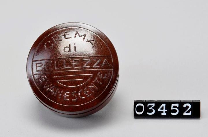 Runde, flache, braune Salbendose aus Bakelit mit nach oben gewölbtem Schraubdeckel mit aufgeprägtem Produktnamen. leicht eingewölbter Boden mit Standring. Boden mit eingeprägtem Firmenlogo (FBA).