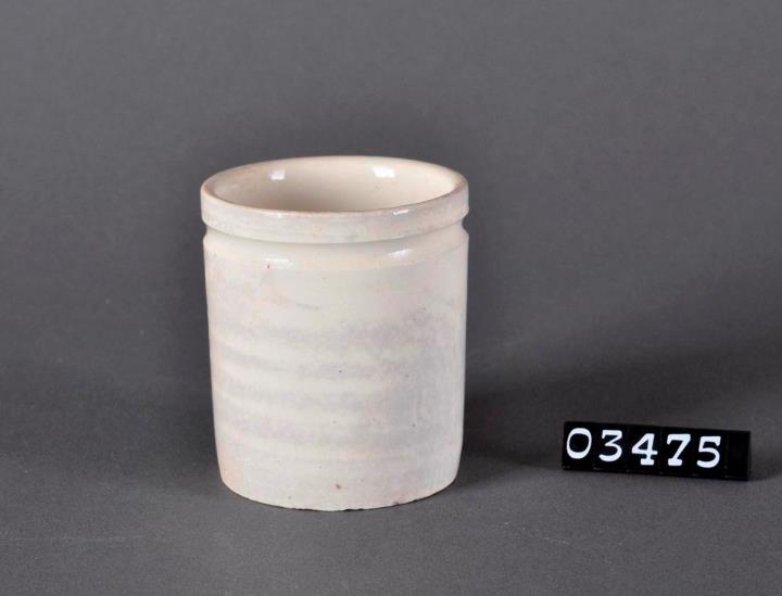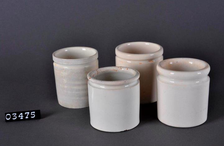 Drei unterschiedliche elfenbeinfarbige Salbentöpfe aus Steingut. Ohne Deckel. Außen und innen glasiert. Mit Binderand. Zwei Gefäßböden glasiert davon einer mit Prägung (50) und (5), zwei unglasiert.