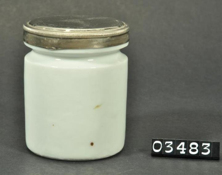 Zylindrischer, weißer Salbentopf aus Steingut. Breiter Rand mit darunterliegender tiefer Rille für Stülpdeckel. Gefäßboden leicht eingewölbt, unglasiert. Seitlich geriffelter Stülpdeckel aus Metall.