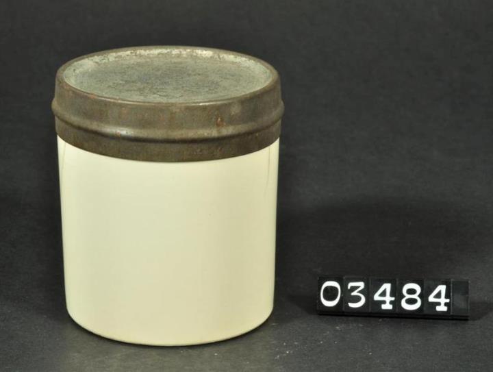Neun zylindrische, elfenbeinfarbige Töpfe aus Steingut für Liebigs Fleischextrakt. Gefäßboden unglasiert, zwei bedruckt, zwei mit Prägung und fünf ohne Prägung. Davon ein Topf mit flachem Stülpdeckel aus Metall.