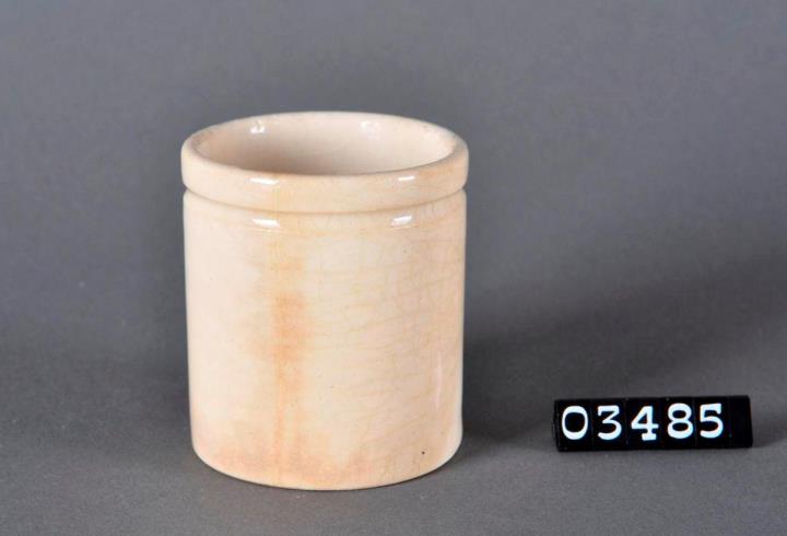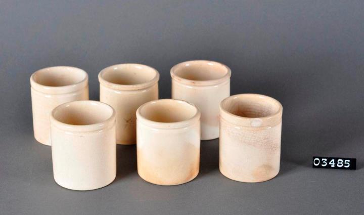 Sechs zylindrische, beige Töpfe aus Steingut. Gefäßboden unglasiert, glatt und teilweise mit konzentrischen Kreisen. Ein Topf mit Bodenprägung (J). Alle mit Ringfurche unter dem Mündungsrand.