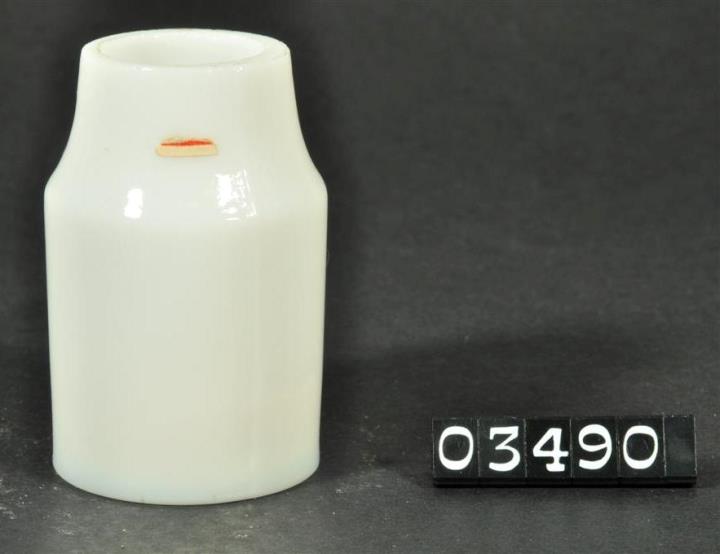 Milchigweißes. leicht konisch zulaufendes Glas mit steiler Schulter und breiter Mündung. Boden stark eingewölbt mit kräftigem Standring und schlecht leserlicher Prägung (75??).
