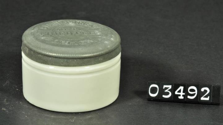 Weißer, runder zylindrischer Topf aus Steinzeug mit geprägtem Stülpdeckel aus Metall. Rille am oberen Wandrand. Gefäßboden mit Standring und eingewölbt. Volumenangabe (20) im Boden eingeprägt.
