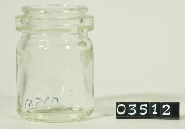 Massives, zylinderförmiges farbloses Glas mit verstärktem Mündungsrand, höchstwahrscheinlich für Aufreißverschluss. seitliche Naht. Vielleicht Verpackung für Liebigs Fleischextrakt.