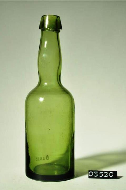 Grüne zylindrische Flasche mit langem, leicht bauchigem Hals und aufgesetzter, nach unten überstehender, konischer Mündung. Unterschiedliche Wandstärke. Boden leicht eingewölbt.