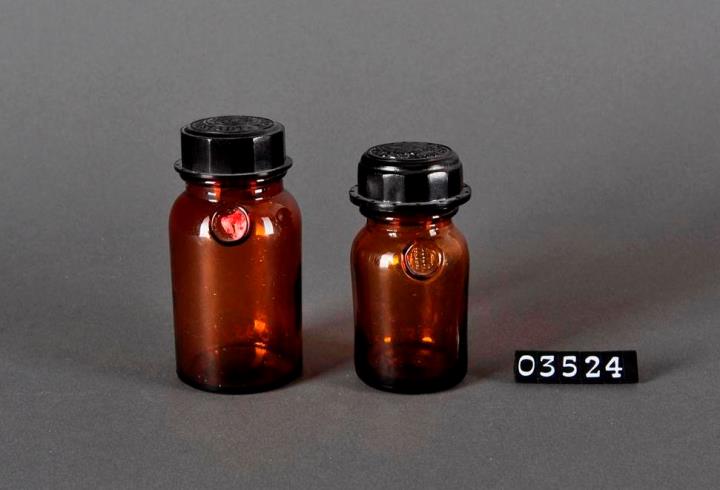 Zwei zylindrische, braune Weithals-Glasgefäße mit schwarzem Schraubverschluß aus Kunststoff mit unterschiedlicher Firmenprägung. Boden mit Volumenprägung. (20 und 40). An der Wand Vertiefung für Sicherheitssiegel.