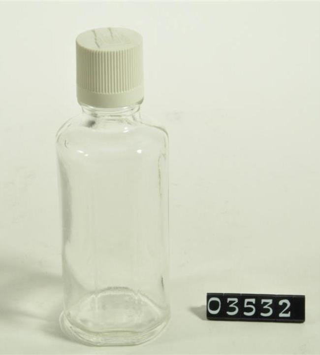 Runde, an zwei Seiten abgeflachte farblose Glasflasche mit flacher Schulter und weißem, seitlich geriffelten Schraubverschluss. An der Oberseite des Schraubverschlusses sind die Könler Domtürme abgebildet. Boden leicht eingewölbt mit Prägung des Volumens, mit Standring.