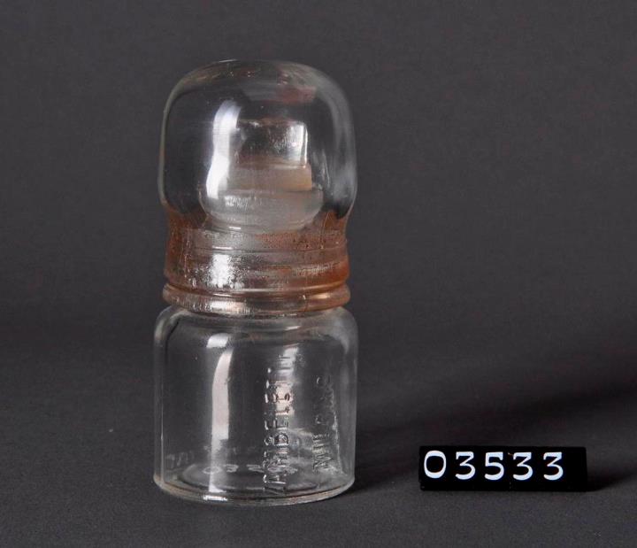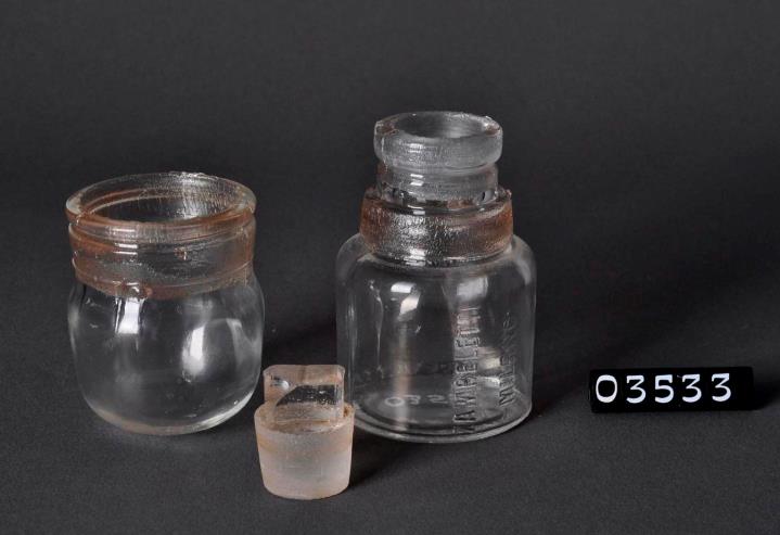Drei runde, farblose Glasbehäler mit Schliffstopfen und aufgeschliffener Glaskappe. Seitliche Naht und seitliche Prägung: Zambeletti Milano und an der Rückseite am unteren Rand: Brevettata.