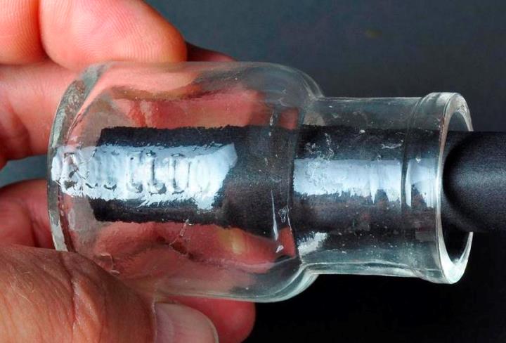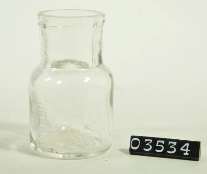 Zylinderformige, farblose Weithalsflasche mit langem Hals und verstärktem Mündungsrand. Boden leicht eingewölbt mit Pragung des Volumens (30). Seitliche Naht und seitliche, schlecht lesbare Prägung, höchstwahrscheinlich Opodeldoc.