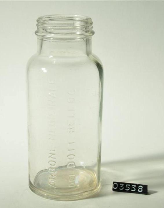 Rundes farbloses Pulverglas mit Schraubgewinde, jedoch ohne Schraubverschluss. Seitennaht. Boden mit Standring, leicht eingewölbt mit Prägung (107). Seitliche Prägung des Produktnamens (Carbone medicinale del Dott. Belloc).