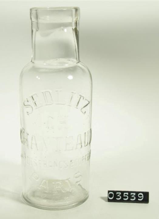 Zylindrisches, farbloses Weithalsglas, maschinell hergestellt, manuell aufgesetzter Hals mit nachgearbeitetem Mündungsrand. War mit einer Bittersalzmischung gefüllt und wurde als Abführmittel verwendet.
