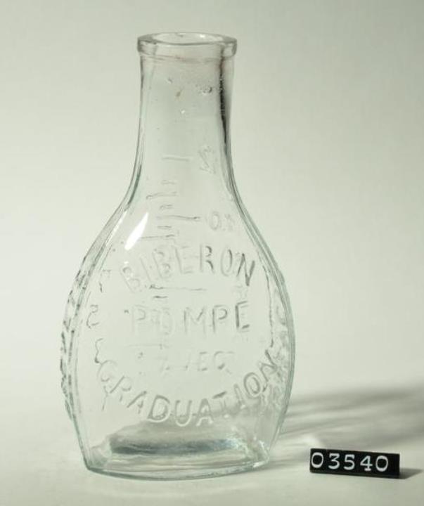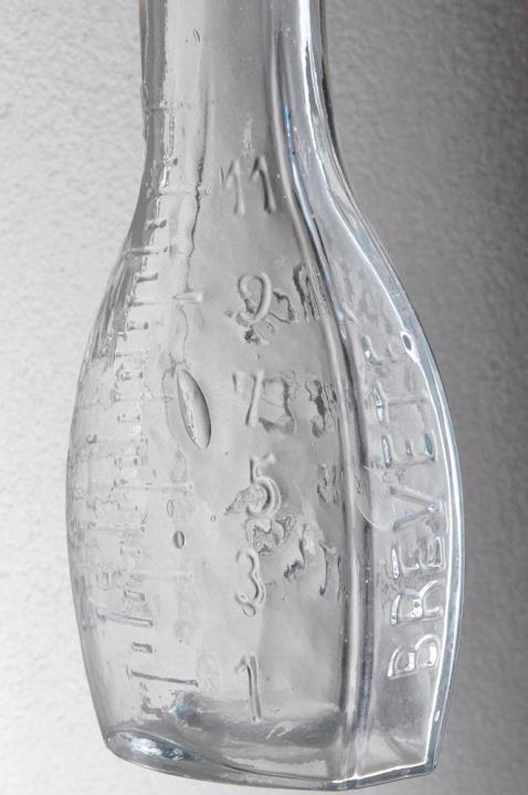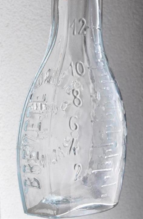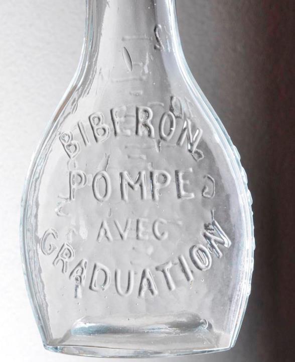 Sieben flache, bauchige, farblose Trinkflaschen für Babymilch. Verstärkter Mündungsrand. Mit Lufteinschlüssen. An beiden Seitenwänden Prägung "Brevetté". Vorderseite: "Biberon pompe avec graduation", Rückseite Graduierung von 1 - 12.