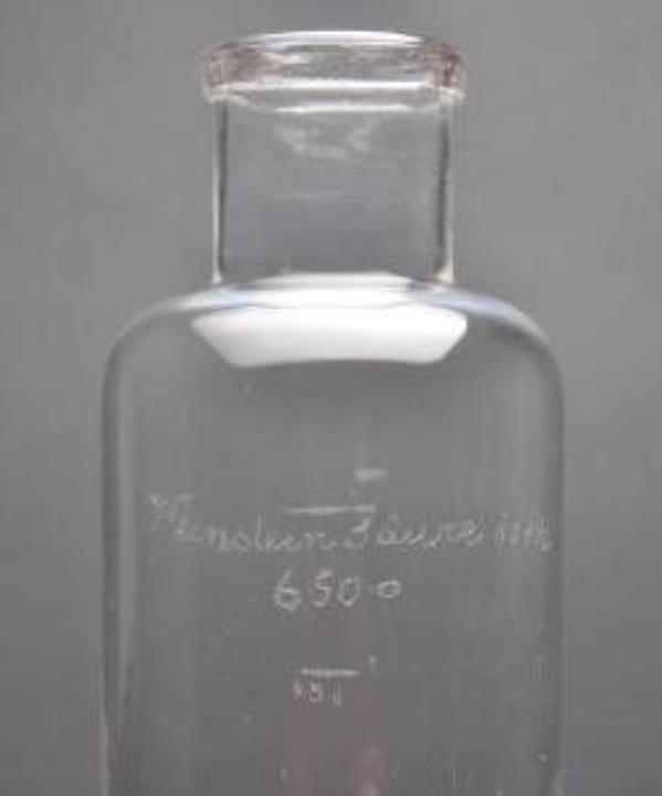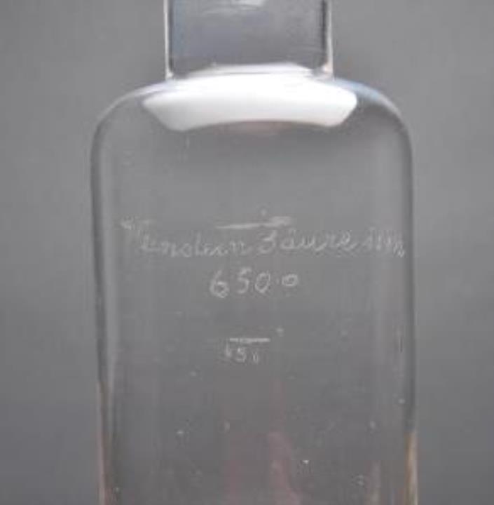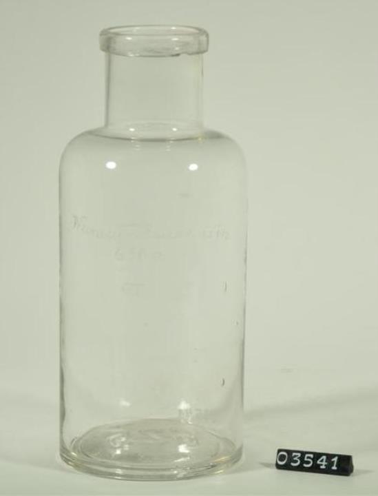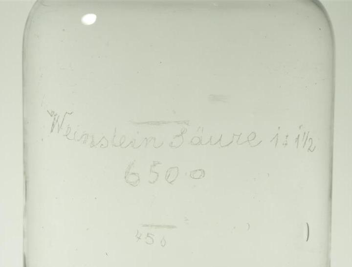 Runde, farblose Weithalsglasflasche mit Gravierungen an der Wand. Diente zur Mischung von Weinsäure. Maschinell hergestellt, manuell nachgearbeiteter Mündungsrand. Boden leicht eingewölbt mit Standring und Prägung des Volumens. Rezepturmengen eingraviert. Wurde zur Kracherherstellung verwendet.