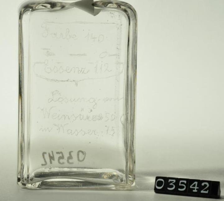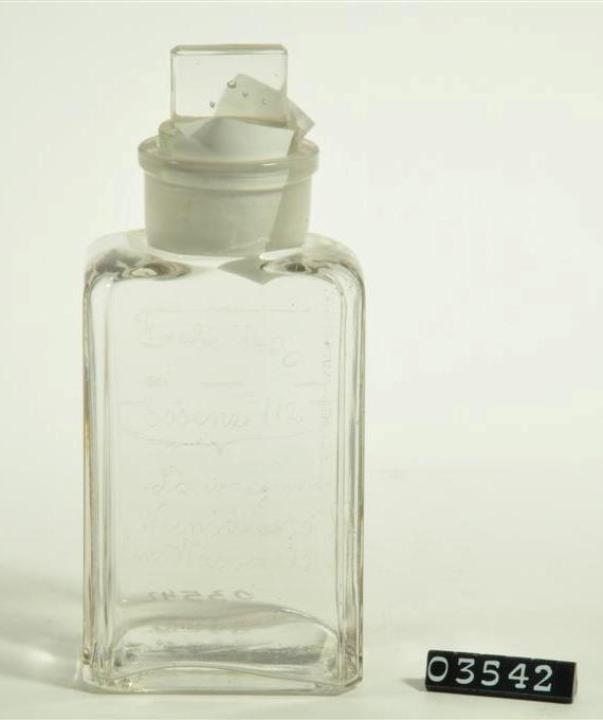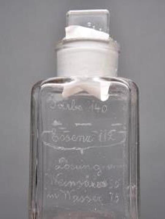 Form-geblasenes, farbloses Medizinfläschchen mit Flacher Schulter und Schliffstopfen. Rezepturmengen z.B. für Weinsäure eingraviert. Wurde zur Kracherherstellung verwendet.