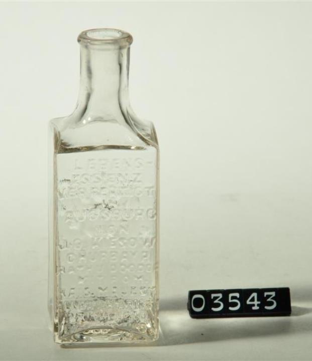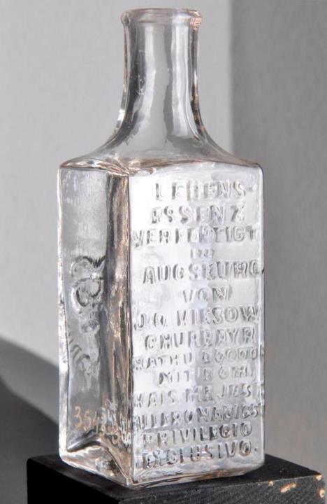 Drei, in der Grundfläche quadratische, farblose Medizinfläschchen für Augsburger Lebens-Essenz von Johann Georg Kiesow. Vorderseite eingeprägter Produktnamen, Rückseite Wappen und Aufschrift "Schutzmarke". Boden rund eingewölbt mit geprägtem Kreuz. Ohne Inhalt, Etikett und Beipackzettel.