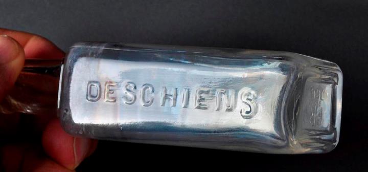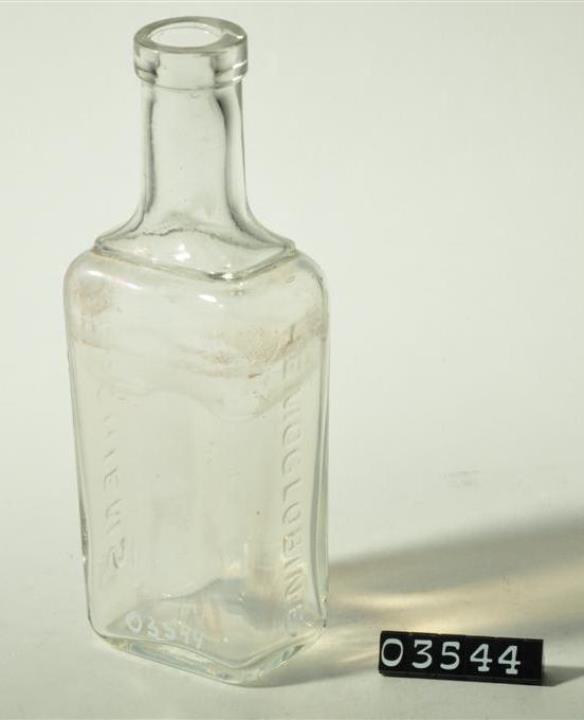 Rechteckige, farblose Glasflasche mit langem Hals. Seitliche Prägungen. Boden mit Standring, leicht eingewölbt mit Prägung (FR). Seitliche Naht. Maschinell hergestellt, manuell nachgearbeiteter Mündungsrand.