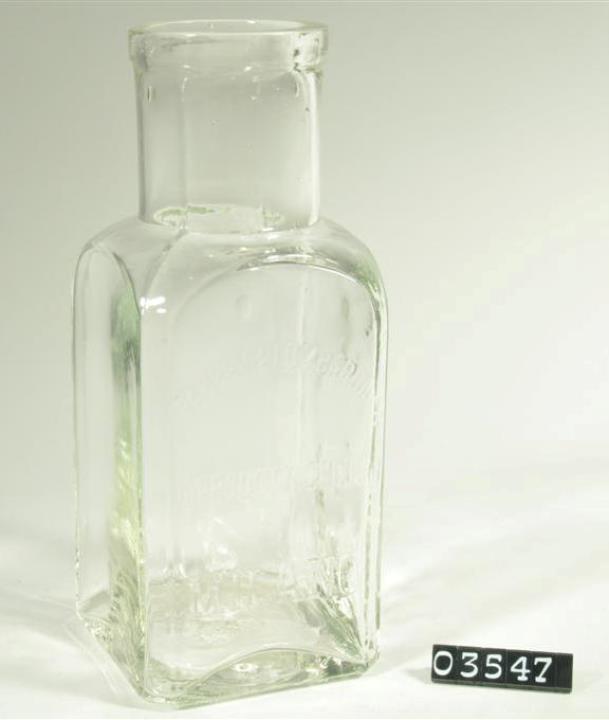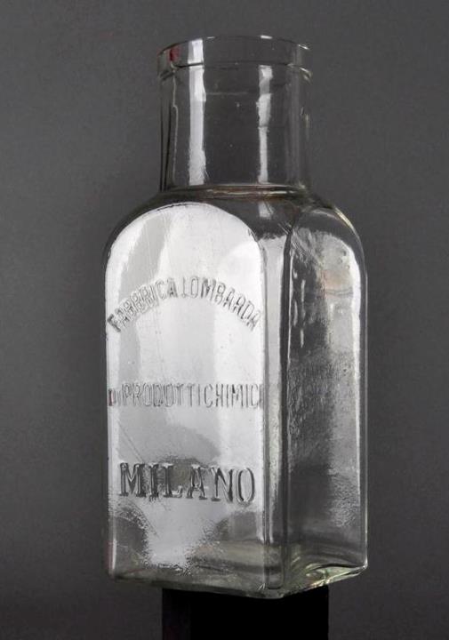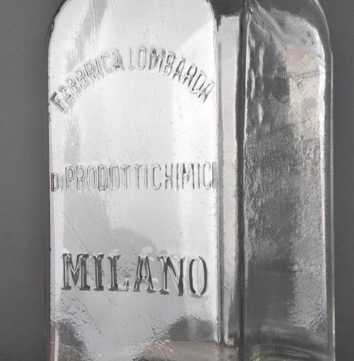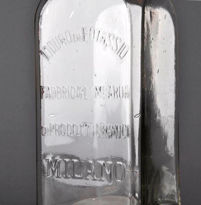Drei, in der Grundfläche quadratische, farblose Weithalsflasche mit abgeschrägten Seitenkanten. Maschinell hergestellt, manuell aufgesetzter Hals. Seitennaht. Prägung an einer Wand "Fabbrica lombarda di prodotti chimici Milano", eine davon mit zusätzlicher Prägung "Ioduro di potassio".