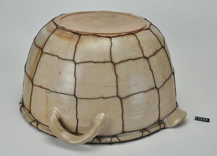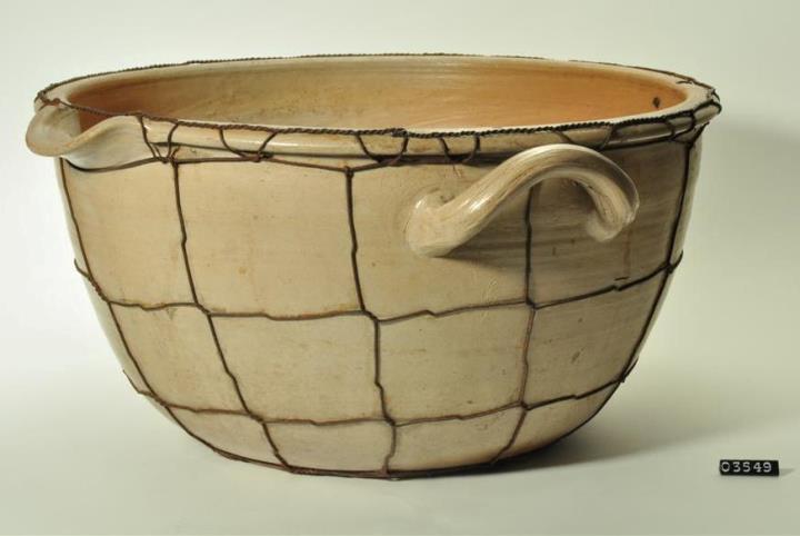 Stark gebauchte graue Schüssel mit verstärktem Rand. Zwei randständige, diametral aufgesetzte Griffe, angesetzter Ausguß. Innen und außen glasiert. Mit Standring, Boden leicht gewölbt. Drahtgeflecht zum Schutz der Schale.