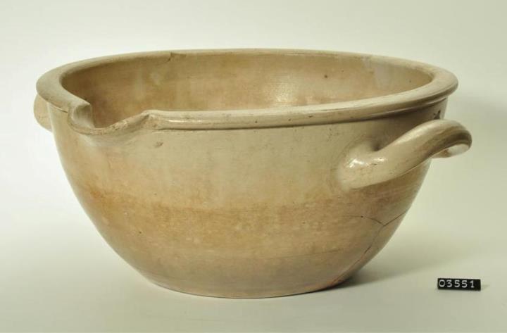 Stark gebauchte graue Schale mit verstärktem Rand. Zwei randständige, diametral aufgesetzte Griffe, angesetzter Ausguß. Innen und außen glasiert. Mit Standring, Boden leicht gewölbt.
