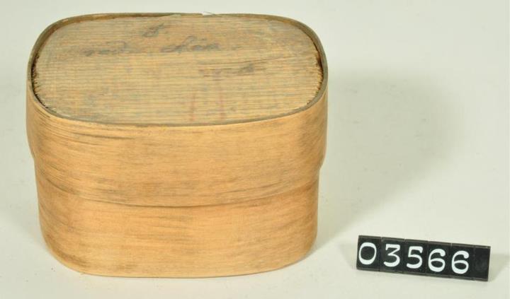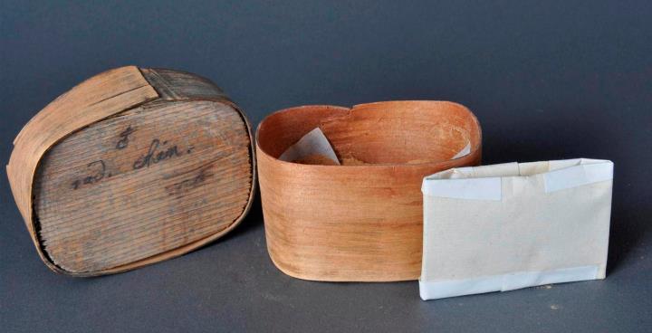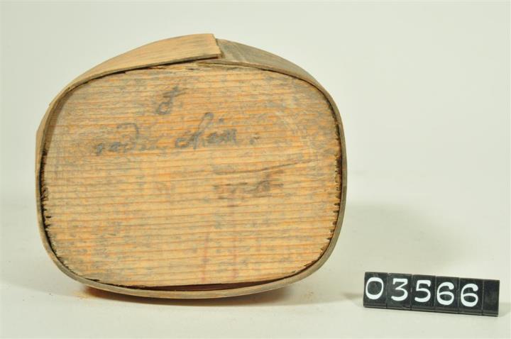 Hellbraune, im Grundriss rechteckige Spanschachtel mit abgerundeten Ecken und Stülpdeckel. Signatur auf dem Deckel. Darinnen Pulver der Chinarinde und zusätzlich ein unbeschriftetes Briefchen mit Pulver.