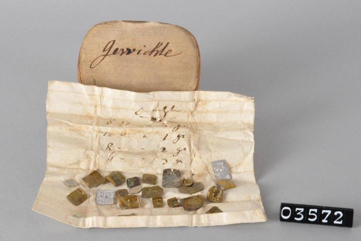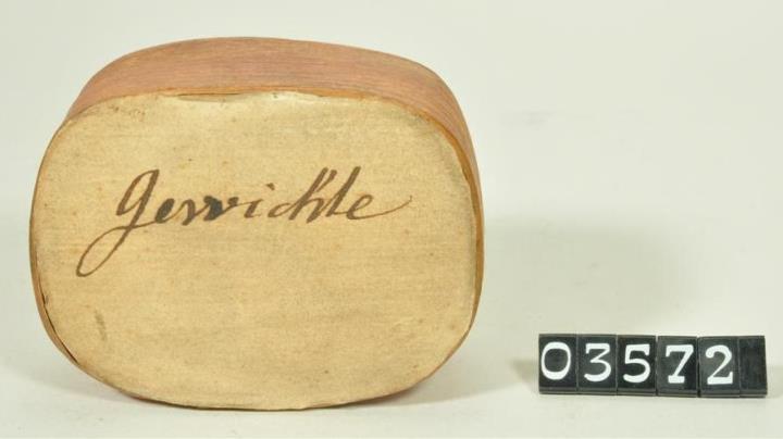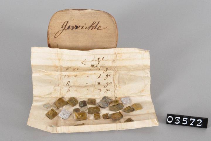 Rechteckige an den Ecken abgerundete Spanschachtel mit Stülpdeckel. Oberseite mit Papier überklebt und beschriftet. Innen mit schwarzer Tinte beschriebener Zettel mit eine Umrechnungstabelle(?) darin eingeschlagen 23 Feingewichte.