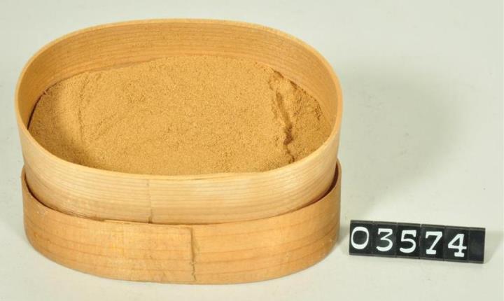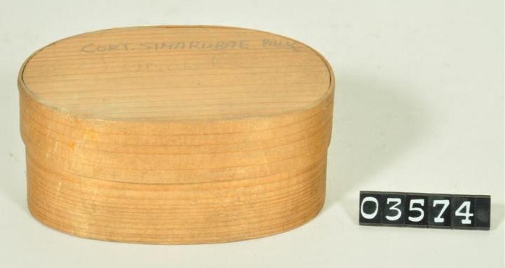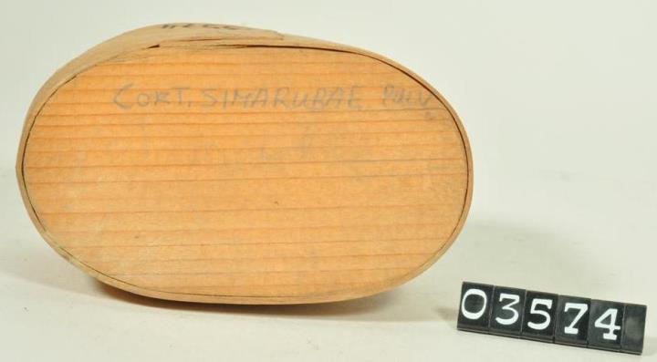 Hellbraune, ovale Spanschachtel mit Stülpdeckel. Deckel mit Bleistift von Elisabeth Fehrenbach-Peer beschriftet. Mit Inhalt. Enthält historische Simarubarinde gemahlen
