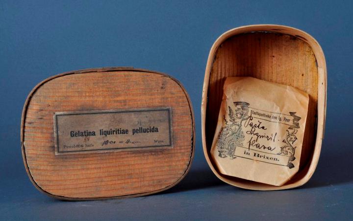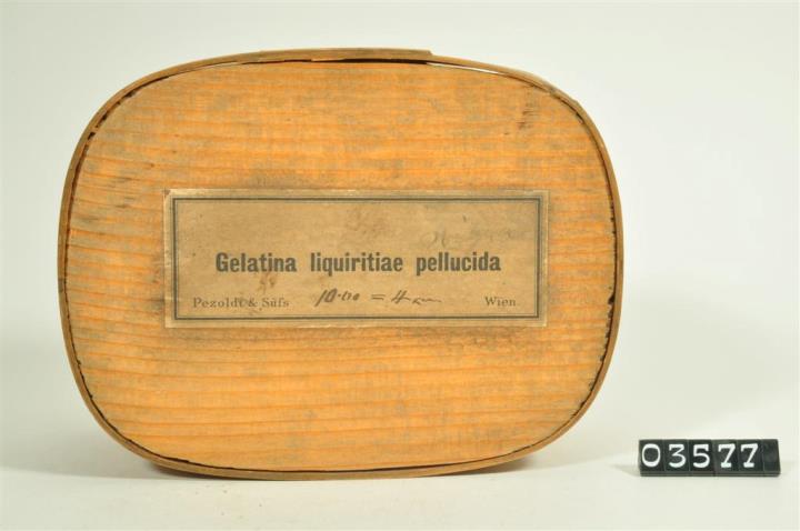 Hellbraune, im Grundriss rechteckige Spanschachtel mit abgerundeten Ecken und Stülpdeckel, ursprünglich Versandschachtel. Gegenüberliegend am Rand der Ober- und Unterseite Einkerbungen für den Spagat. Deckel mit bedrucktem Etikett der Firma Pezoldt & Süßs, Wien. Darunter mit Tinte handschriftliche Preisangabe. Mit Inhalt. Enthält ein Briefchen der Stadtapotheke des Ig. Peer mit Pasta Liquiritia flava = ein Süßholzaufguss mit Vanillegeschmack = Bärndreck.