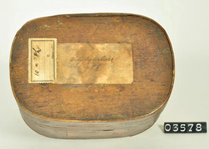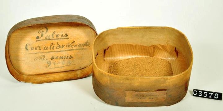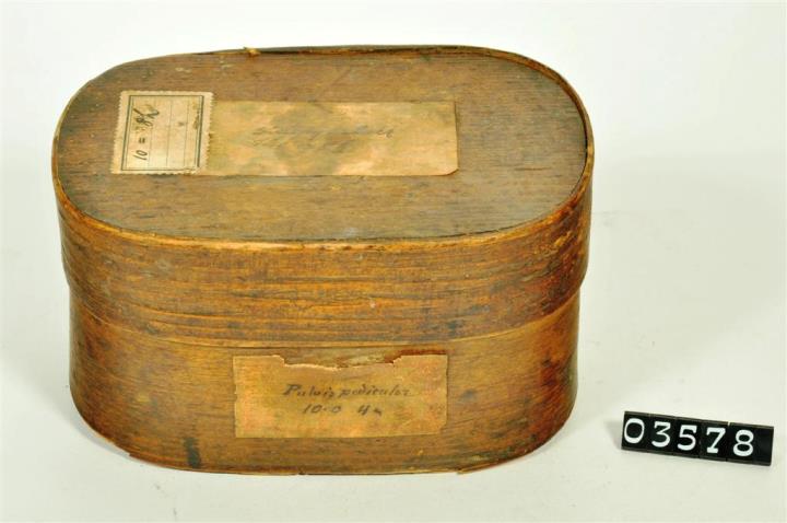 Braune, im Grundriss rechteckige Spanschachtel mit abgerundeten Ecken und Stülpdeckel. Auf dem Deckel handschriftlich beschriebenes Schild mit Läusepulver. Ebenda gezähntes kleines Schild mit Preisangabe. Mit Inhalt. Innenseite des Deckels ist wie folgt beschriftet: Pulvis Cocculide Levante semis.