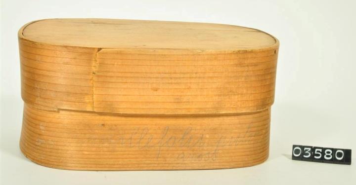 Hellbraune, im Grundriss unregelmäßig-rechteckige Spanschachtel mit abgerundeten Ecken und Stülpdeckel. Leer. Seitlich mit Bleistift signiert. Enthielt Schafgarbenkrautpulver.
