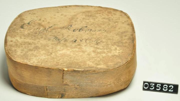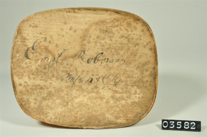 Braune, im Grundriss unregelmäßig-rechteckige Spanschachtel mit abgerundeten Ecken und Stülpdeckel. Deckel mit Papier überzogen und mit schwarzer Tinte beschriftet. Leer. Enthielt ein rotes Wehrpflaster.