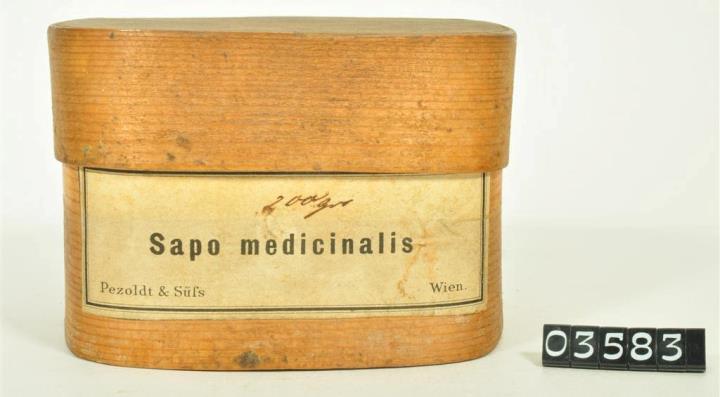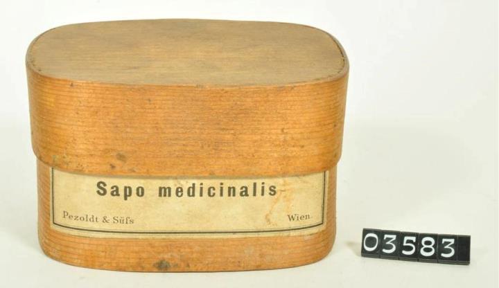 Hellbraune, im Grundriss leicht unregelmäßig-rechteckige Spanschachtel mit abgerundeten Ecken und Stülpdeckel. An der Seitenwand Etikett der Firma Pezoldt & Süßs, Wien. Enthielt medizinische Seife. Leer.
