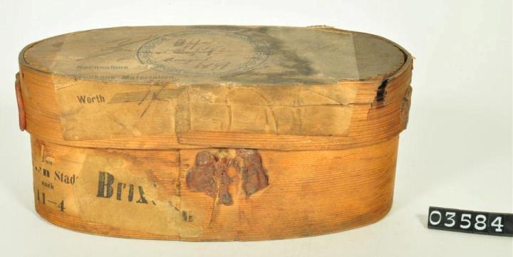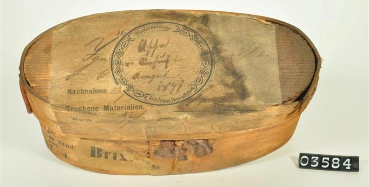 Ovale, braune Spanschachtel mit Stülpdeckel. Wurde als Versandbehältnis der J. Weis' Mohren-Apotheke Wien recycelt, an Deckel und Seitenteilen noch Reste von Siegellack und von der Versandadresse. auf dem Deckel rundes unleserliches Etikett der Stadtapotheke des Ig. Peer. Inhalt: graues, magnetisches Pulver.