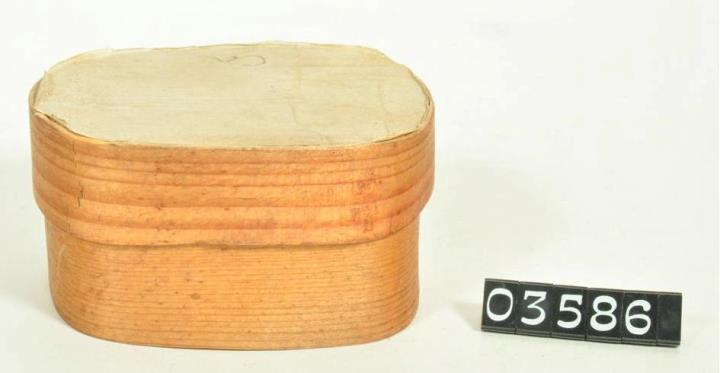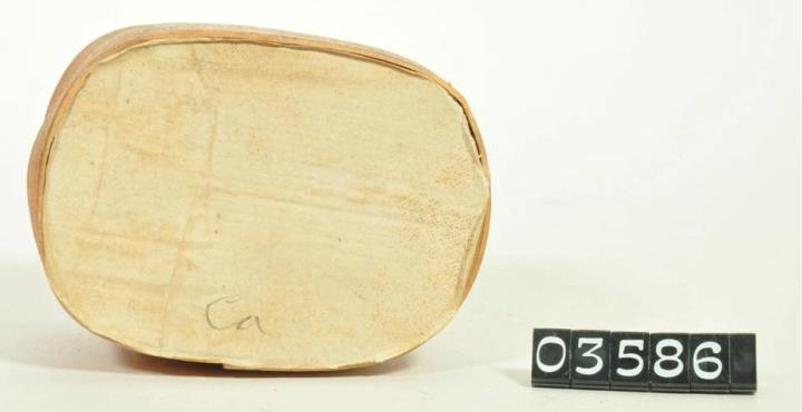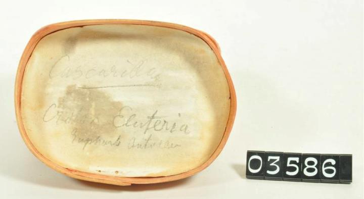 Hellbraune, außen unbeschriftete im Grundriss viereckige Spanschachtel mit abgerundeten Ecken und Stülpdeckel. Deckel außen und innen mit Papier überzogen. Deckelunterseite mit Bleistift beschriftet: "Cascarilla". Leer. Enthielt Kaskarillrinde.