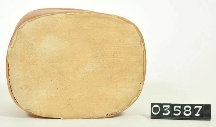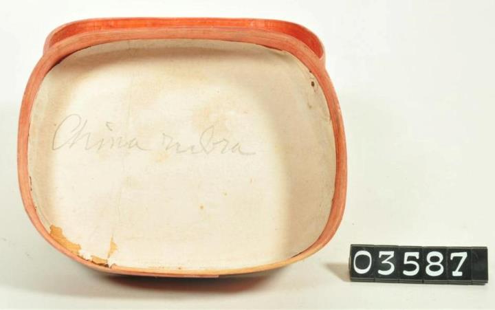 Rotbraune, außen unbeschriftete, im Grundriss viereckige Spanschachtel mit abgerundeten Ecken und Stülpdeckel. Deckel außen und innen mit Papier überzogen. Oberseite Deckekl: mit Bleistift geschriebenes "R". Deckelunterseite mit Bleistift beschriftet: "China rubra". Leer. Enthielt roten Chinarinde.