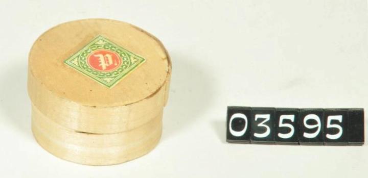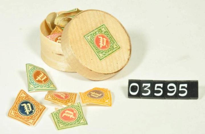 Kleine, runde Spandose mit Stülpdeckel. Darauf ein farbig bedrucktes, rautenförmiges Etikett mit stilisiertem P. Darin 28 verschiedenfarbige ebendiese Selbstklebeetiketten mit stilisiertem "P"