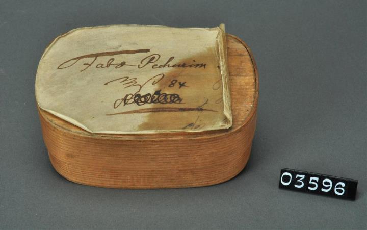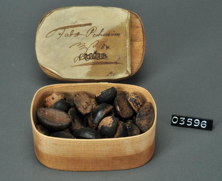 Rechteckige, an den Ecken gerundete Spandose mit überklebtem und signiertem Stülpdeckel. Mit schwarzer Tinte beschriftet. Schild teilweise fettig und zumTeil abgelöst. Enthält Pechurimbohnen.